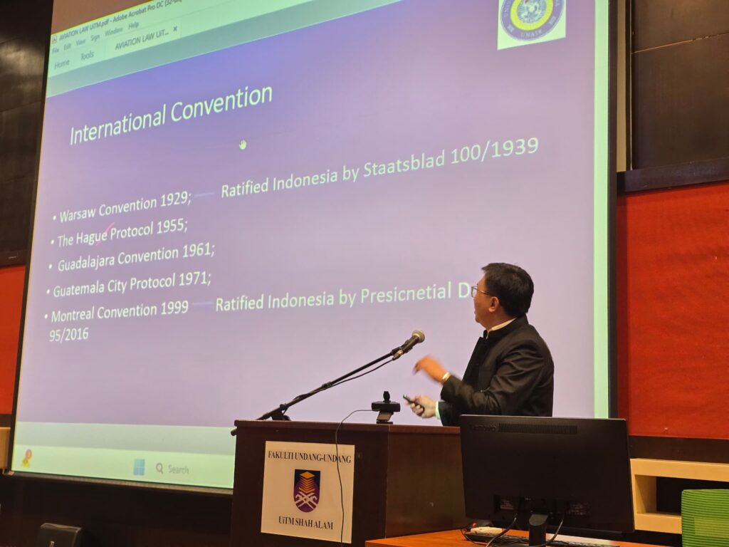 The session, held at Auditorium 1 of the UiTM Faculty of Law, featured a presentation titled “The Montreal Convention 1999 and Its Application in Indonesia: A Passenger Rights Perspective.” The lecture formed part of UiTM’s Law of Carriage series and attracted students and faculty members interested in international air law and aviation liability frameworks.