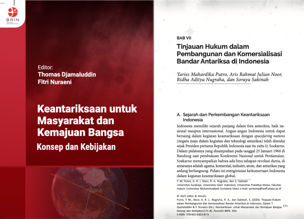 The chapter, titled “Tinjauan Hukum dalam Pembangunan dan Komersialisasi Bandar Antariksa di Indonesia,” examines the legal foundations, challenges, and prospects of Indonesia’s spaceport development as the country moves toward greater engagement in global space activities. Co-authored with Aris Rahmat Julian Noor, Ridha Aditya Nugraha, and Soraya Sakinah, the chapter provides an in-depth legal analysis relevant to Indonesia’s transition from a traditional spacefaring participant to a state preparing for commercial launch activities under an emerging global space economy.